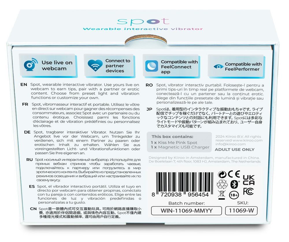Spot er udstyret med 6 forudindstillede manuelle tilstande, som bekvemt kan styres med et tryk på en knap direkte på den smalle (ydre) ende af vibratoren. Det er endnu mere spændende at bruge Spot via Bluetooth/Wi-Fi/app til interaktiv sjov. FeelConnect-appen giver mulighed for individuelle justeringer af vibrationer og lysshows, synkronisering med musik og videoer, samt fjernspil og fjernstyret interaktion med din partner. FeelPerformer giver dig mulighed for at oprette forbindelse til webcam platforme i realtid for at præsentere dine egne intime shows live. Spot scorer med en stærk Bluetooth-forbindelse og over 4 timers batterilevetid for pålidelig sjov uden afbrydelser.